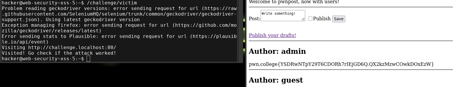 db.execute("""CREATE TABLE posts AS SELECT ? AS content, "admin" AS author, FALSE AS published""", [flag]) db.execute("""CREATE TABLE posts AS SELECT ? AS content, "admin" AS author, FALSE AS published""", [flag]) @app.route("/publish", methods=["GET"]) defchallenge_publish(): if"username"notin flask.session: flask.abort(403, "Log in first!")