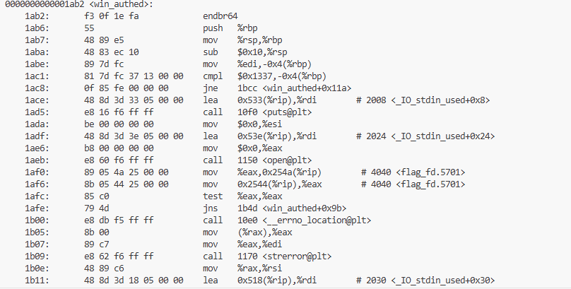 但是这里有一个问题,我们不能跳转到0x1ab2,因为win函数入口处存在对参数值的校验,只能跳转到校验逻辑的后面,比如0x1ace