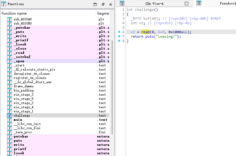 拖进IDA,看到溢出点发生在challenge函数,如图