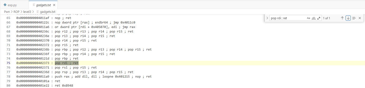 之后在gadgets.txt中搜索到ret指令和pop rdi指令: