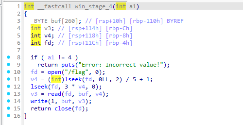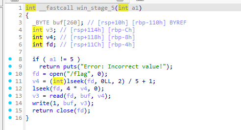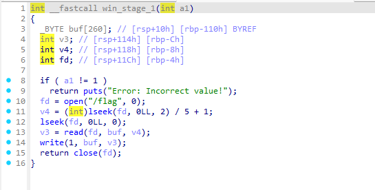 接下来尝试寻找后门函数,注意到IDA逆向结果显示有5个win函数,基本可以猜测就是输出flag的后门函数,分别点进去分析源码,如下5张图所示