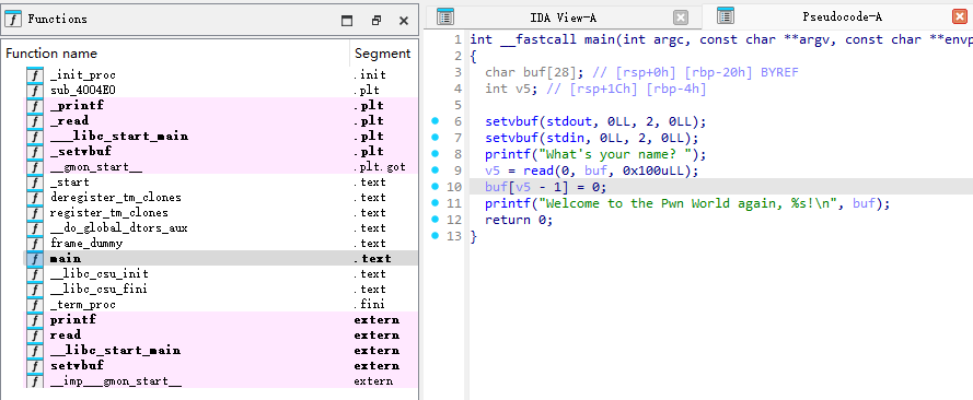 可以看到溢出点发生在main函数,并且从左侧的函数表来看没有明显的后门函数