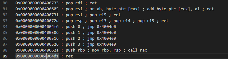 如上图所示,最终找到可用的pop rdi、pop rsi和ret指令的碎片分别在0x400733、0x400731和0x4004d1的位置