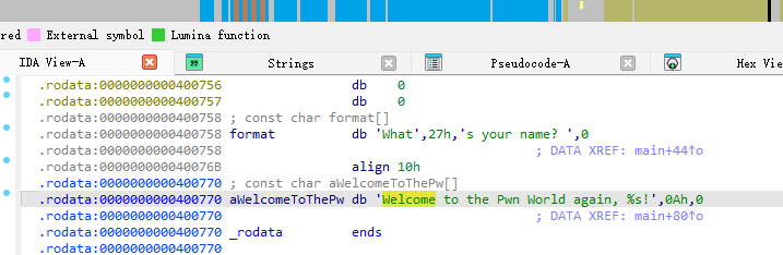 接下来希望能找到程序本身存在的格式化字符串,在IDA中使用shift+F12,可以看到在程序的只读数据段(.rodata)存在%s格式字符串,如图: