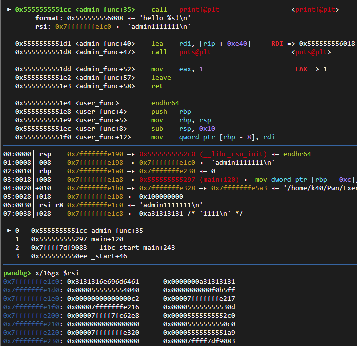 漏洞点分析 首先checksec,看到没开canary,其他都开了: 进入IDA,发现溢出点在main函数的fgets,允许我们输入256字节,可以覆盖到返回地址: 有puts函数,想到可以ret2libc 但是开了PIE,如果采用二阶段打法,先调puts泄露libc地址,需要泄露elf的基地址才能用gadget去控rdi,或者用别的办法泄露libc 进一步分析发现admin_func里存在输出功能,如下: user_func也类似: 这里学到一种新的思路:未初始化(memset)的情况下,栈上有可能残留和ELF相关的真实地址,于是调试分析一下 最终可以看到,在admin_func输出之前,栈上确实有一个ELF的真实地址: 因此利用思路为ret2libc,难点在于泄露地址,解决方法就是找一个在printf之前固定会有的的地址,通过溢出控制最后0x00截断的位置刚好到那里,类似下图: 可以看到倒数第二行固定有一个ELF文件地址,偏移是0x11a9,这个值是固定的,只要泄露该地址-0x11a9就能得到ELF地址进而得到gadget,然后就是常规的二阶段打法ret2libc了