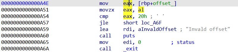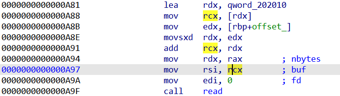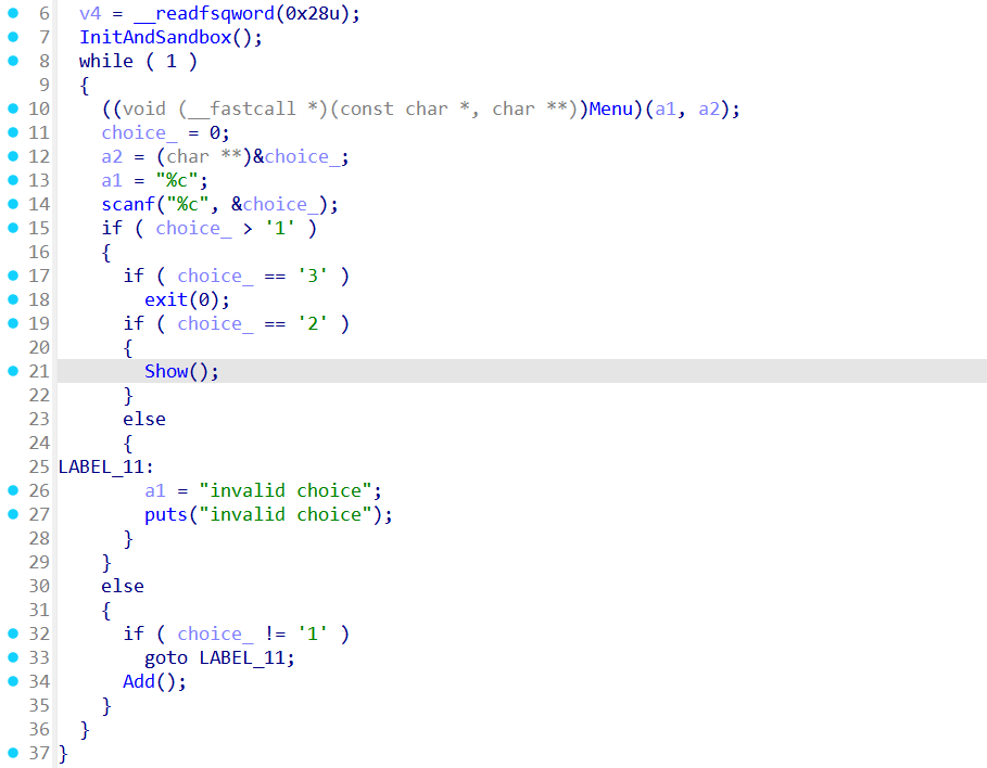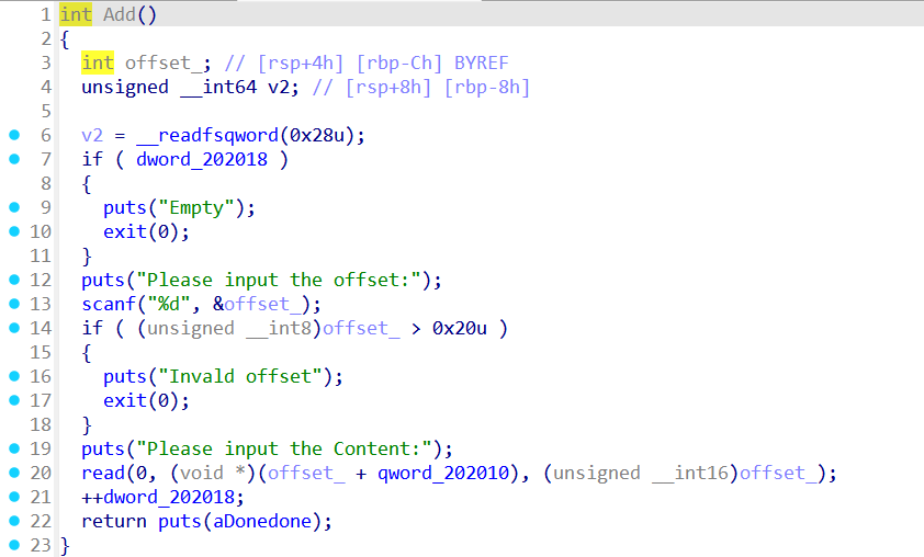 漏洞点分析 首先看main函数: 可以看到是一个菜单程序,有Add和Show两种功能 同时进入main函数后,初始化的同时开启了沙箱,且分配了0x40大小的堆块,并把堆块指针放在0x202010偏移: 接着立刻查看沙箱,发现只ban掉了execve系统调用: 然后既然看了沙箱,那一起再看一下checksec: 发现保护全开,想到应该是打IO或者hook。 接下来进入Add功能进行分析,会往所申请的堆块+0ffset的地方写入数据,且由于0x202018位置的自增,我们只有一次写入机会: 注意,这里很容易以为是直接把数据写入0x202010偏移的bss段,但从汇编能看出来,实际是往 0x202010偏移的地方 存的那个指针 所指向 的内存写东西(即*0x202010=堆块指针=写入的地方): 在Add函数部分,注意到对offset的校验,采用的是将offset强转为uint8_t类型后检查是否大于0x20,也就是说仅检查offset的最后一个字节是否超过(这里从反编译结果不容易注意到,可以直接看汇编,如下图): 因此这里我们有了一个任意写的原语(只要偏移的最后一个字节不超过32,条件已经算很宽松了) 接下来同样看Show功能: 根据前面对Add的分析,这个函数实际也是打印堆块里的内容 并且也只有一次的Show机会 综合上述分析,本题唯一的漏洞在于Add功能中检查offset不严格,导致一个几乎任意偏移的写入原语,不存在malloc和free接口,应该要打IO。接下来思考如何利用