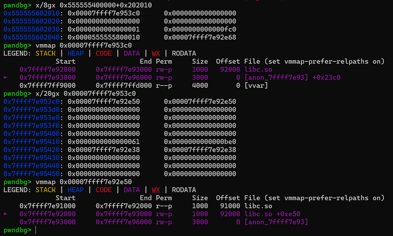 利用过程 于是和glibc的House系列类似,借助前述分析的任意地址写去伪造IO_FILE里的函数指针,这里选择写到_stdout_FILE,将write这个函数指针改到longjmp即可 但现在还差一个libc地址,关于如何泄露musl libc的地址—— 其实通过调试可以发现,在程序一开始,申请的堆块中会残留一个musl的地址,如图: