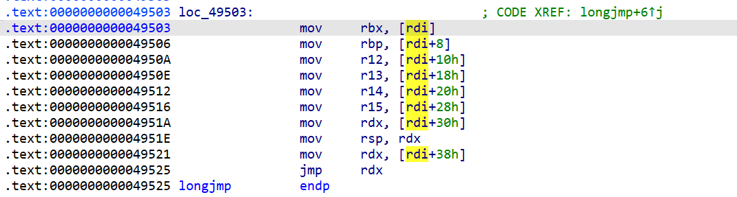 musl libc的setcontext 分析完musl libc的IO,为了做出这道题,我们还需要一个类似glibc里的setcontext这样的函数,或者更具体地说,需要一段类似setcontext+61这样的汇编片段,借此完成栈迁移 通过查阅资料可知,musl libc中存在一个叫做longjmp的函数,搜索到的结果暗示这是一个和上下文设置有关的函数,于是在IDA中搜索到该函数,并注意到如下的汇编指令: 从图中可以很容易确定,这就是musl libc里对标setcontext的函数